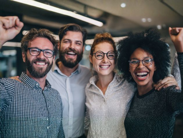 A diverse group of confident professionals standing together and smiling, representing leadership and reinvention within a legal department.