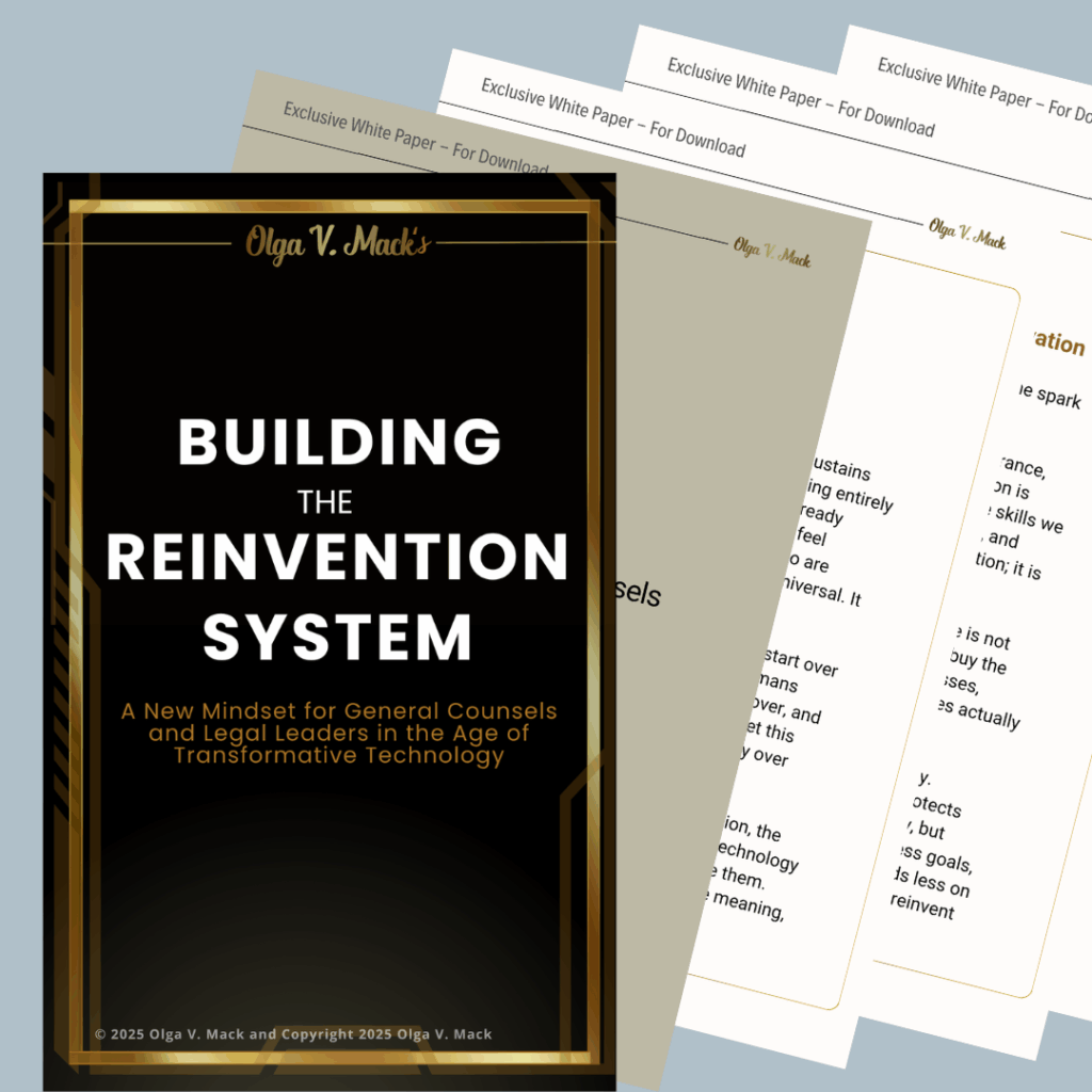 Ready to move beyond innovation alone? Olga V. Mack’s Building the Reinvention System introduces a practical framework for legal leaders to turn adaptability into a daily habit, helping General Counsels evolve faster than technology, align progress with purpose, and lead with human judgment in an age of transformation.
